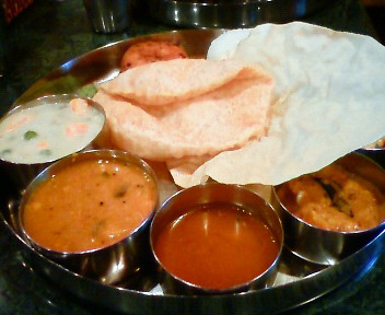 憧れの「ダルマサーガラ」 銀座です ここは南インド料理のお店です こんな感じです ゴージャス!! 北インドではターリーと呼びますが 南インドはミールスと云います 反対側から撮ったのが こちら 手前のがワダという揚げ物 となりの緑&オレンジのペーストをつけます そのとなり クリームシチューみたいですが ココナツ味のカレーです 酸味があるのと スパイス使いが 北インドのカレーとは ちと違います これも おいし~んですよ♪ 料理とは関係なく 感動したのは インド人スタッフの頭の小ささ (*_*) 南インドの人たちの体型って すんごいですね 日本人の頭の2/3しかない!! で すっごい足長~ 12頭身か?!っての・・・ 漫画の登場人物みたいです ほんと カレー もちろんおいしいですけどね つまんないことにばっか 目が行きがちで どうもスミマセン・・・ |
